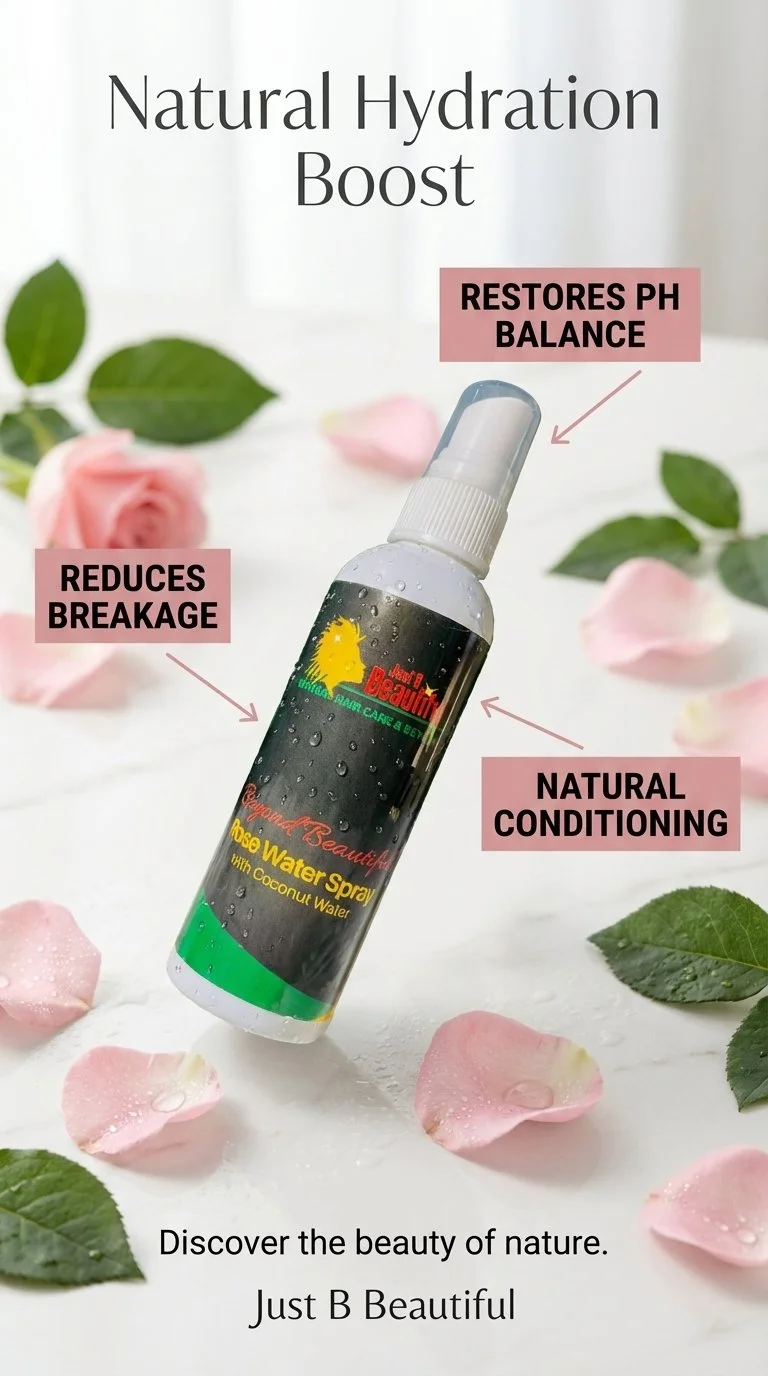 At Just B Beautiful, we believe in the power of nature to bring out the best in your hair. Our Rose Water Spray is crafted with this philosophy in mind, offering you a product perfect for maintaining the vitality and health of your natural hair. Priced at just $15.00 for a 4 oz bottle, it's an affordable luxury that your hair will thank you for.